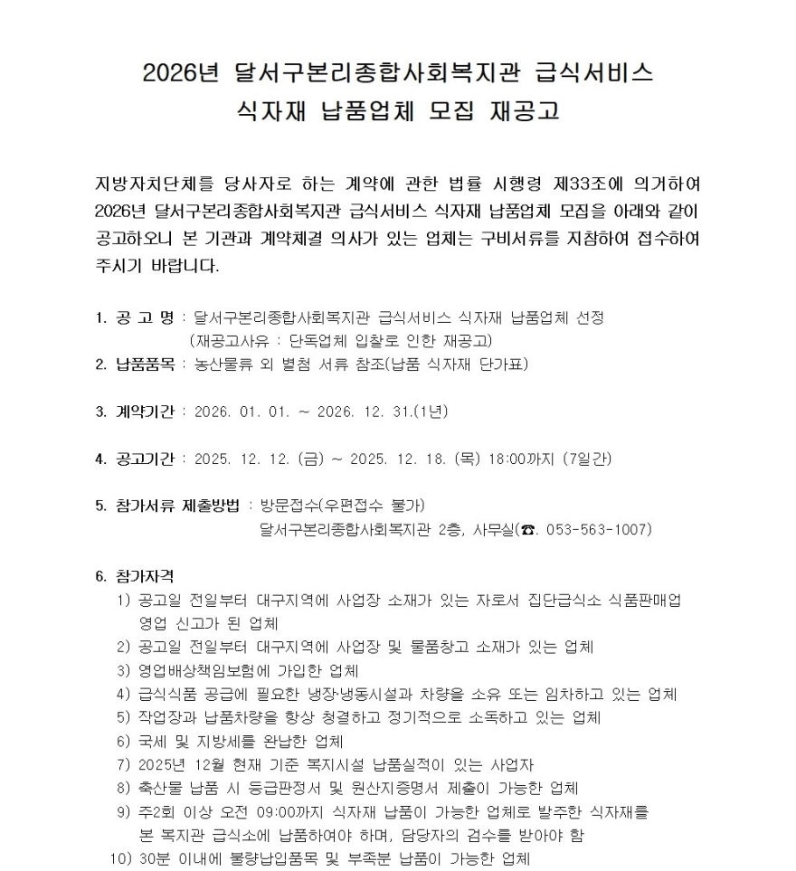 | 2026년 본리종합사회복지관 급식서비스 식자재 납품업체 모집 재공고 |