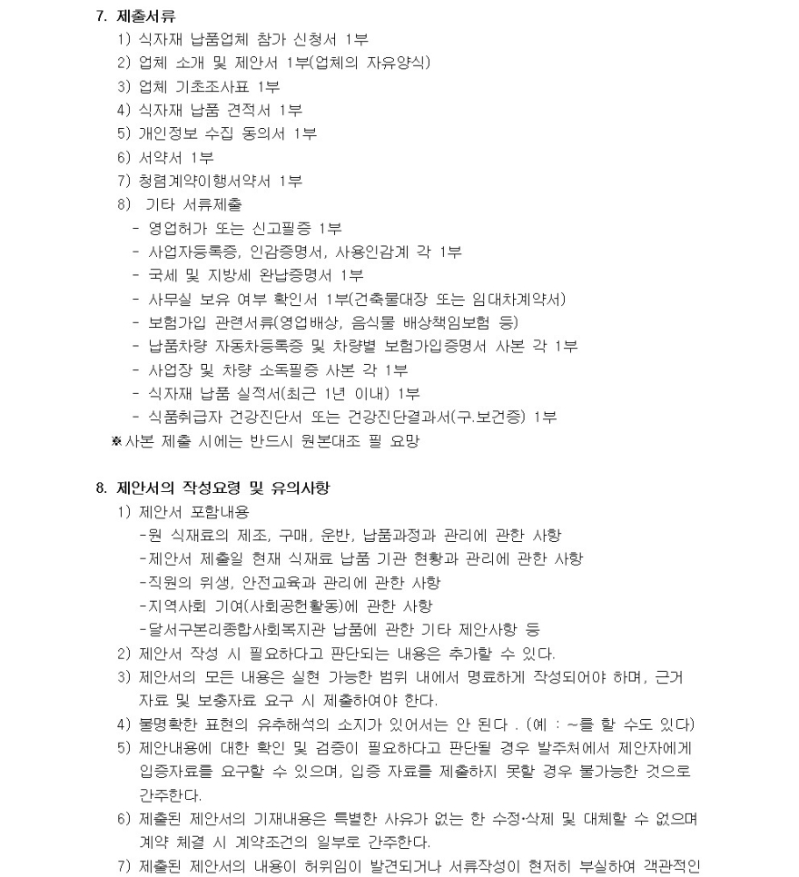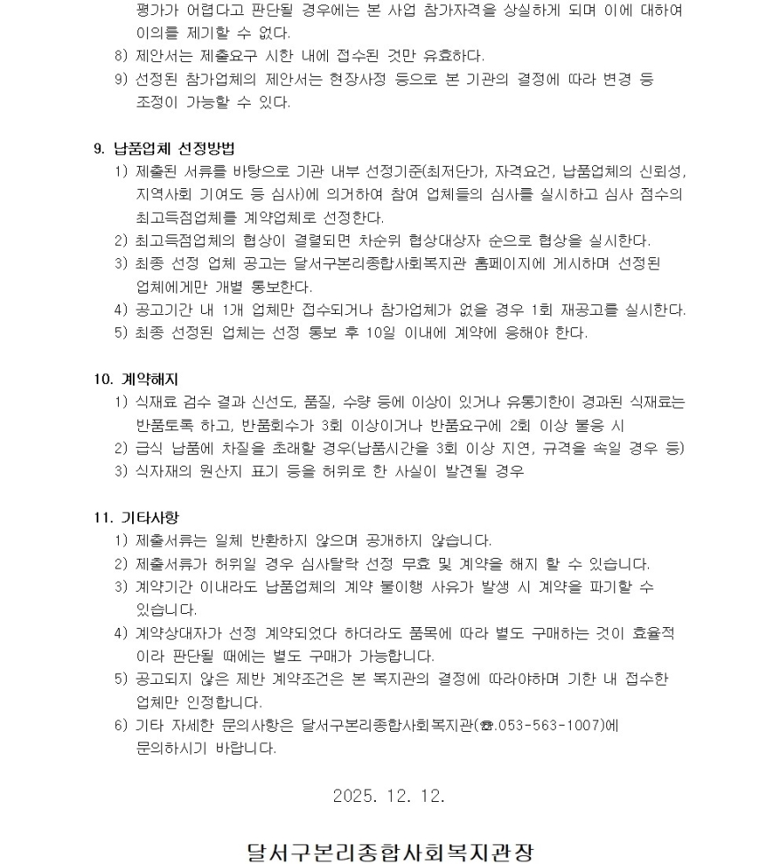 | 첨부파일 : 공고문_2026년 달서구본리종합사회복지관 식자재 납품업체 재모집(2025. 12. 12.).hwp (56 KB) 2026년 업체 신청양식모음(2025 양식)(0).zip (199.8 KB) | ||