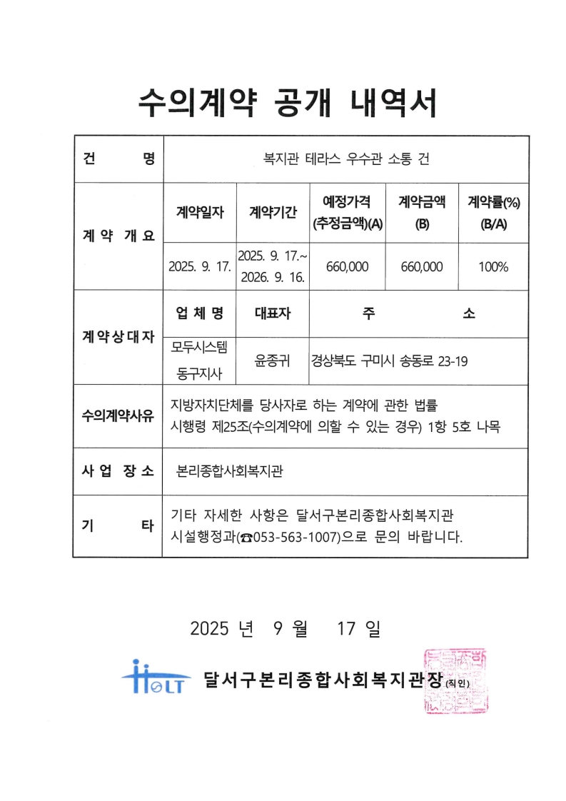 | 2025년 수의계약 공개 내역서(복지관 테라스 우수관 소통 건) |