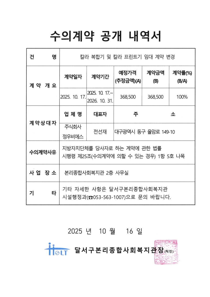 | 2025년 수의계약 공개 내역서(칼라 복합기 및 칼라 프린트기 임대 계약 변경) |