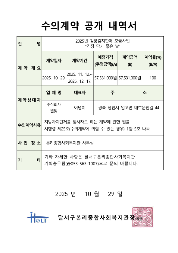 | 2025년 수의계약 공개내역서(2025년 김장담기 좋은 날 김장김치 납품) |