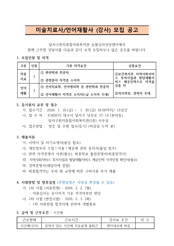 | 늘봄심리상담센터 미술치료사 및 언어재활사 (강사) 채용 공고 |