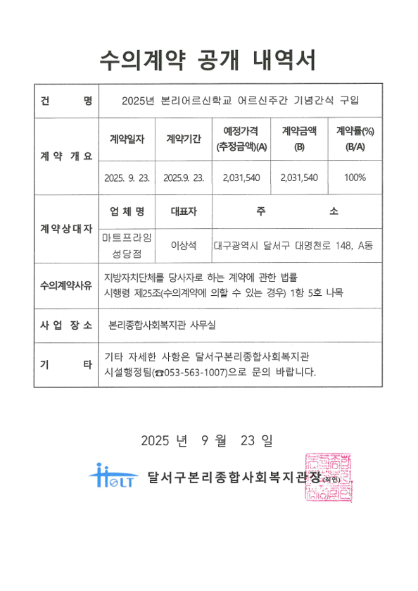 | 2025년 수의계약 공개 내역서 (본리어르신학교 어르신주간 기념간식 구입) |