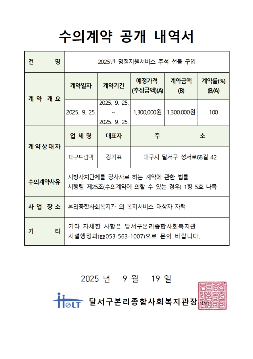 | 다음글 | 2025년 수의계약 공개 내역서(명절지원서비스 대상자 지원 생필품 구입) |