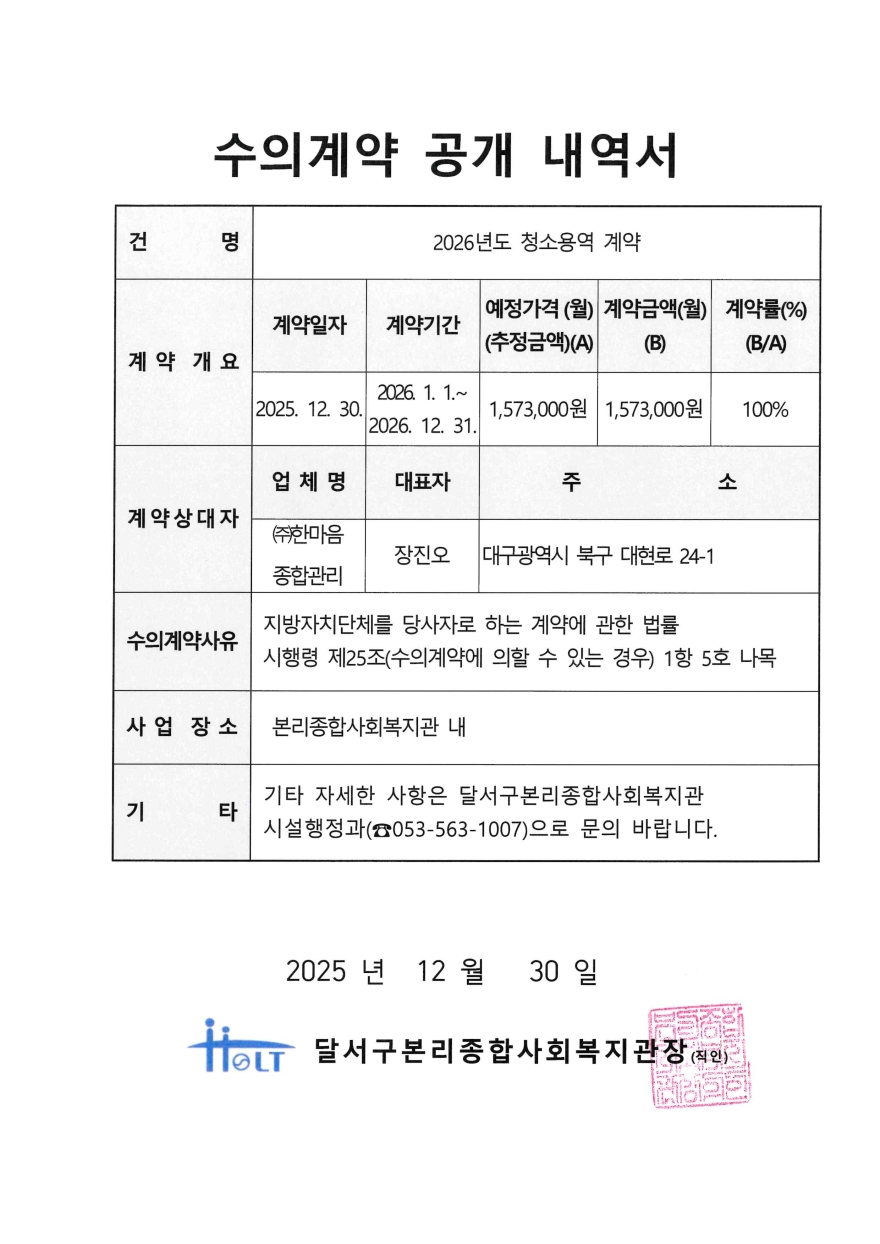 | 2026년 수의계약 공개 내역서(청소용역 계약) |